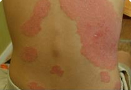 환부가 점점 늘어나고 병변이 융합되어 특징적인 판형의 병변이 나타납니다.