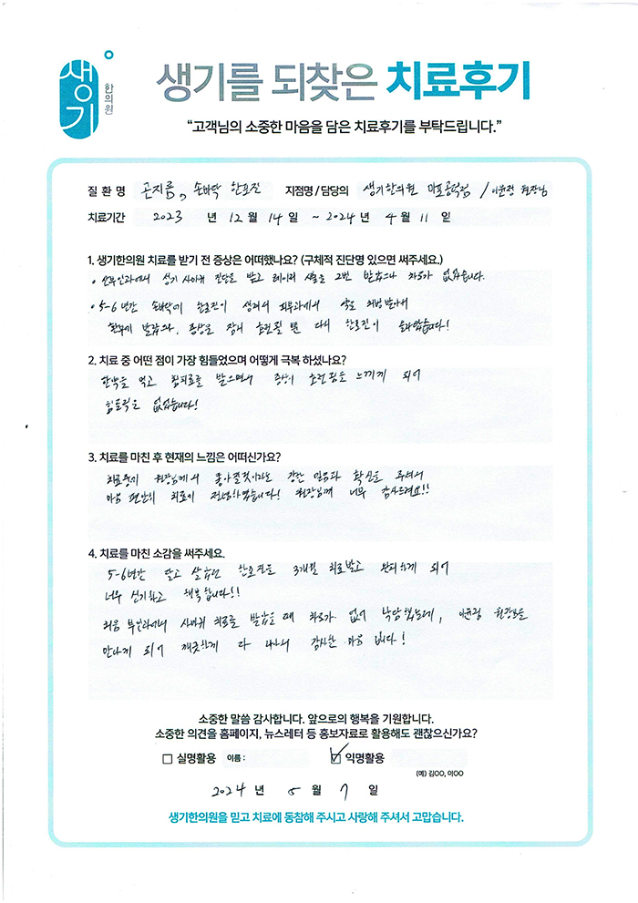 생기한의원과 함께하신 생생한 자필 및 영상 후기를 소개합니다.